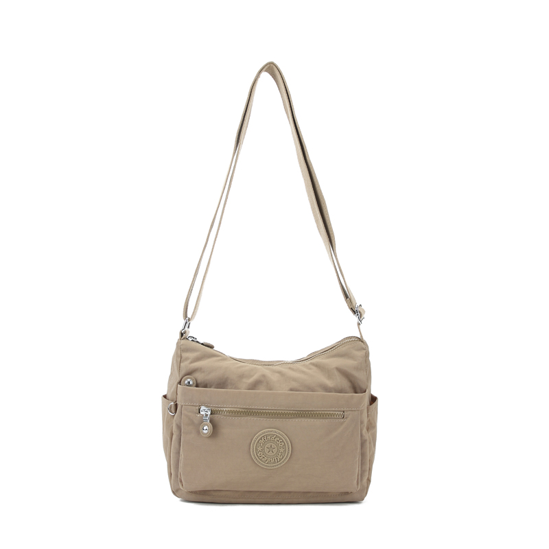 Big on space with sleek finish. Everyday handbag with a partiotioned main cavity divided by 2 zips. Several more compartments including side pockets and a key holder. Waterproof , Feather weight, durable and washable. Measures L27 by W12 by H22 CM.