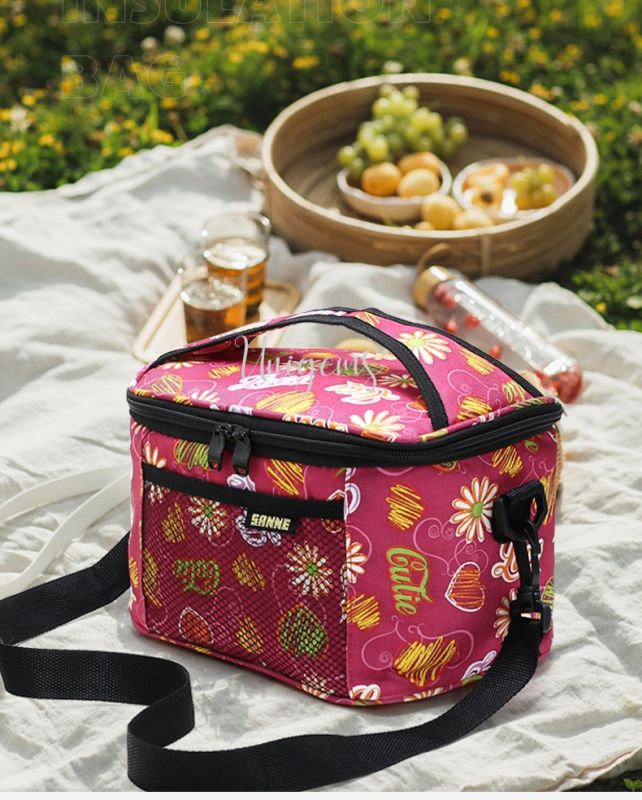 Insulated lunch bags, plastic insulation, keeps food hot or cold for 6 to 12 hours. Easy to clean and washable. Measures L23 by H15 by D15 CM.