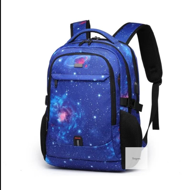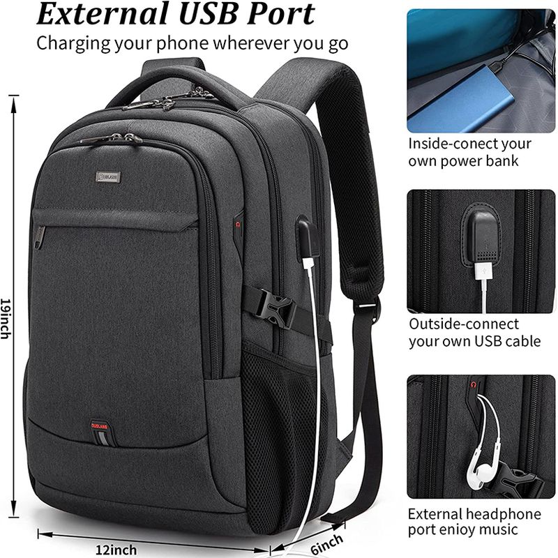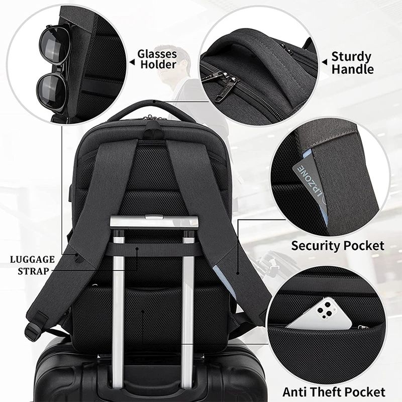 Premium backpack with a dedicated laptop compartment and lockable zips. Concealed zip pocket for valuables. Usb outlet and cable included. Spacious main cavity, accessory pockets, card holder, sunglass holder, back support and chest support belt.