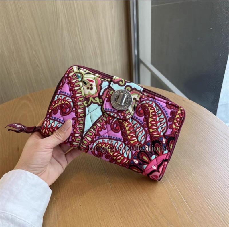 Double sided large wallet. One side has a turn lock and holds upto 12 cards and a bill compartment. The other compartment is zipped all round and opens up into a wallet with card slots and note compartments. Also has an outer zip pocket for coins.