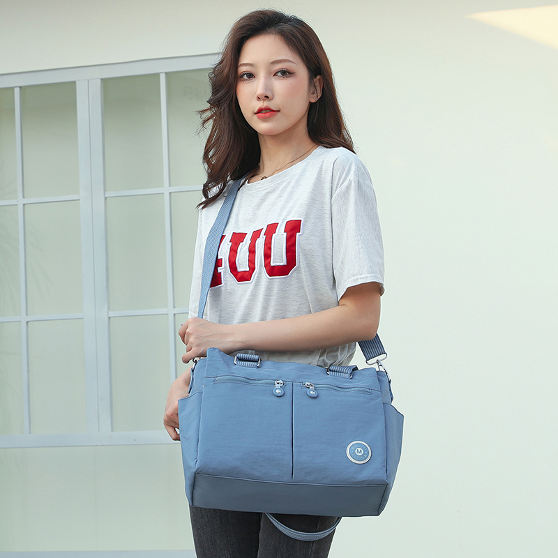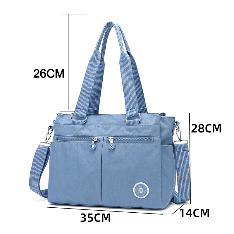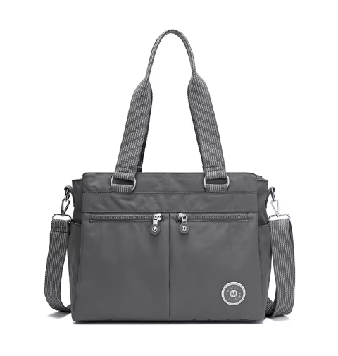 Large spacious tote bag , divided in 3 full size sections, can accommodate a laptop and lots more. Several utility compartments . Two way carry option as a tote or a crossbody handbag. waterproof, Feather weight, Durable and Washable. Measures L35 by W14 by H28 CM.