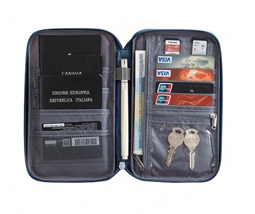 Keeps all your travel documents in place, passports , boarding pass, tickets, sim cards, credit cards, keys, cash and more. Has a front slip pocket , detailed internal pockets and a full length back zip pocket. Carry handle. Ideal for families .