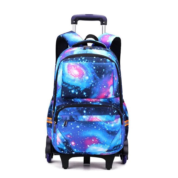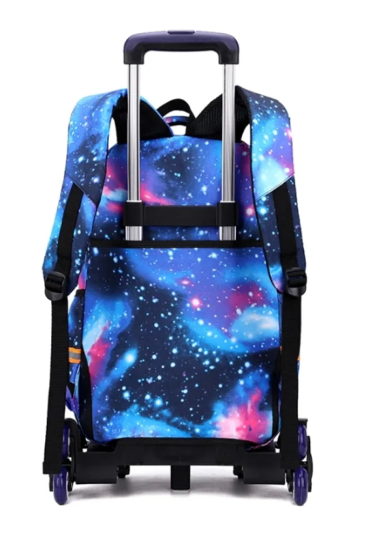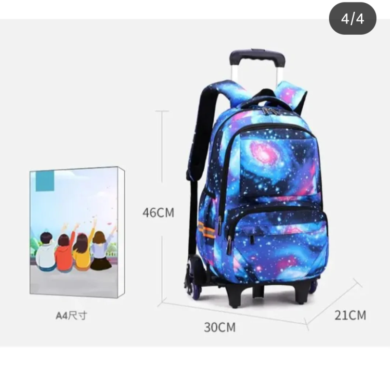 Girls trolley bag . Backpack size 18 inches. Detachable 6 wheel Trolley.Backpack can be used on its own. Light weight , durable backpack with multiple storage compartments .